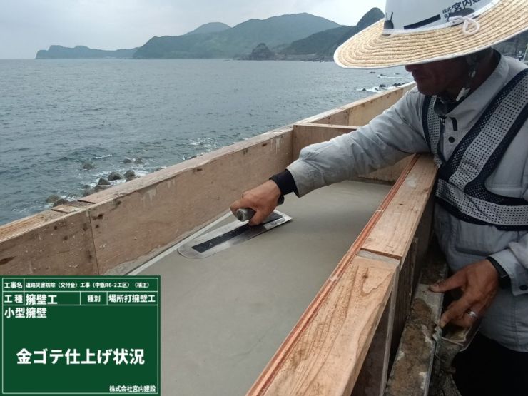 打設完了後、コンクリート表面がいい感じに硬化が入ったところで、仕上げに金ゴテで押え。