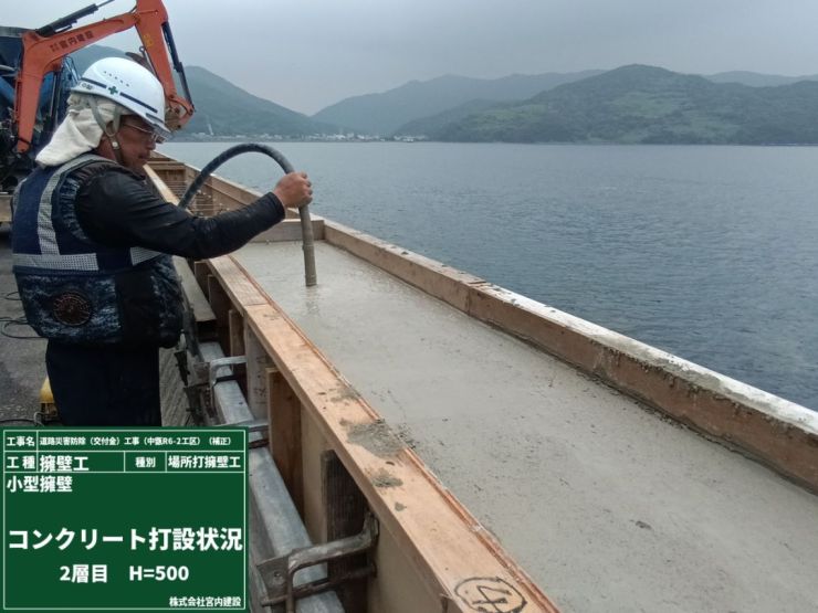 バイブレーターでしっかり締め固めながら、ジャンカや気泡が出ないように慎重に作業中。