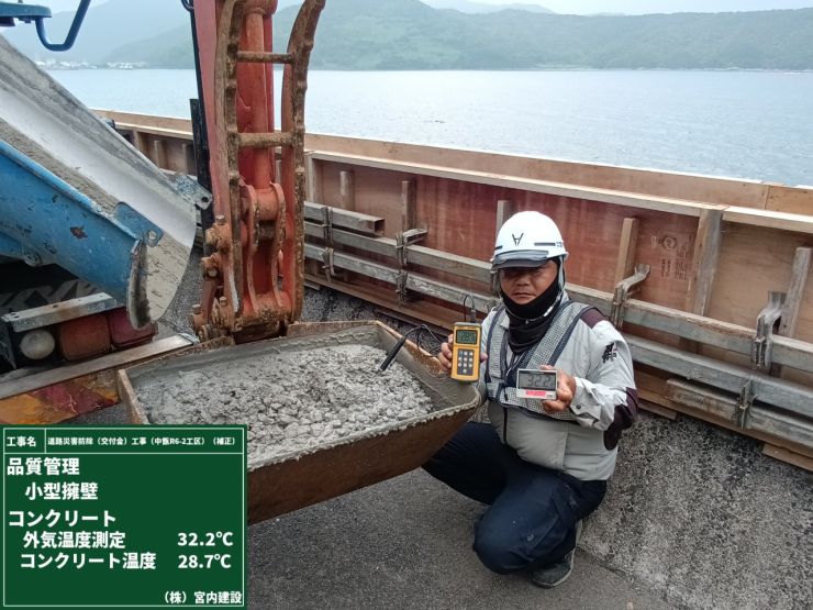 小型擁壁の打設の日です。型枠と鉄筋のチェックをバッチリ済ませて、生コンクリートの状態を確認していよいよコンクリート流し込み開始。