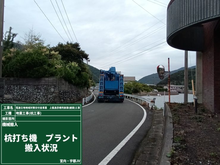 港からトレーラーに乗せ、誘導員を配置して工事現場に搬入しましたが道も狭くなかなか一苦労